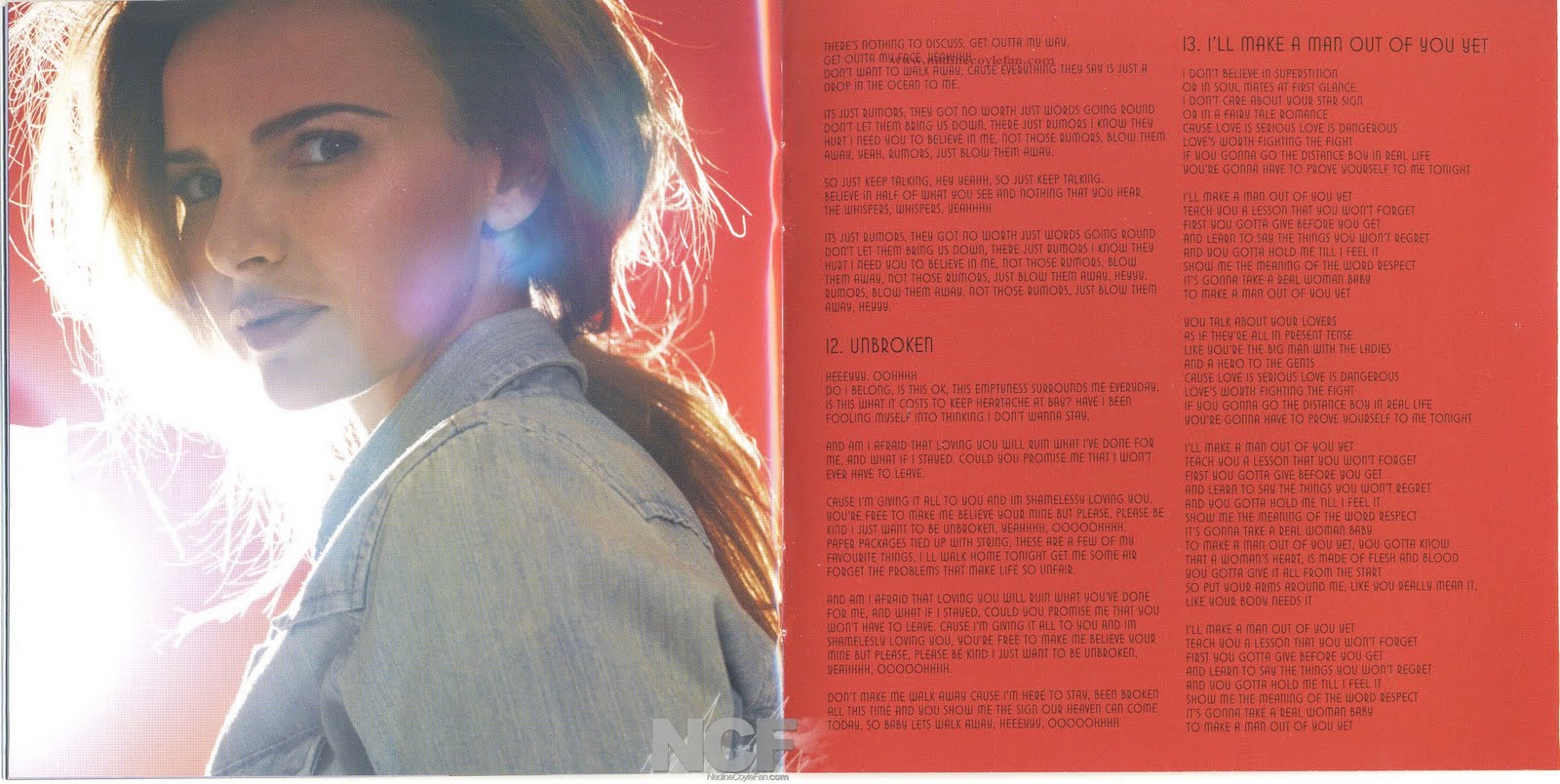 The scattered photo style is one that both this digipak and my own share however with a big difference. My motif I used to show the photography as I knew our images were strong and showed our style and message to the audience by its colour symbolism and delicate style. Nadine Coyle's digipak however has used this style to create a 'personal' feel for the audience as the image show the artist's personal photographs of her friends and family. This makes the audience feel like they 'know' the artist and Nadine is letting them see her in a new light because they have bought her album. This would make them want to buy more products of hers, thinking they would get to know her more if they did.